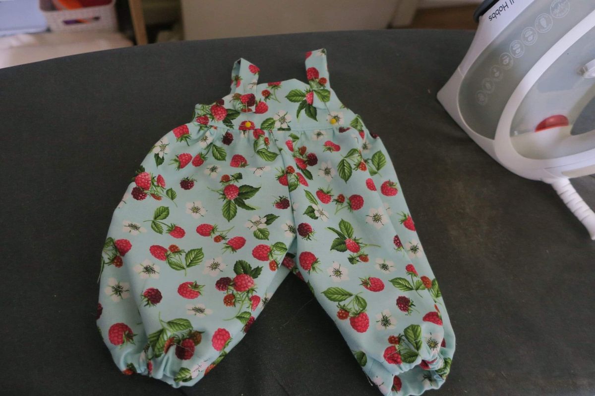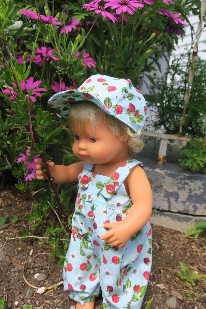 Doll overalls to fit 38cm doll (Miniland doll is pictured). The overalls and cap are made from cotton fabric which has a light blue background and a summery raspberry print. The overalls are secured at the back with a hand-sewn nickel dome fastener with a red button decoration. The shoulder straps are secured with red buttons.