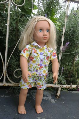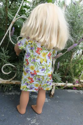 Pretty floral pajamas for spring and summer fun. The pajamas and made from a cotton print fabric with butterflies, pansies and daisies. The pants have an elastic waist and the pajama top has two purple buttons.
