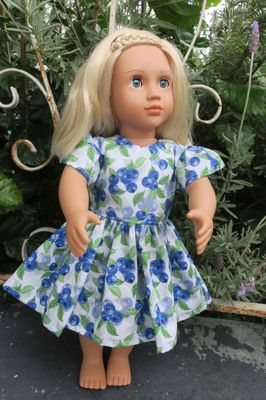 Overalls made from cotton fabric with a pretty blueberry print. The overalls have shoulder sleeves with enclosed elastic, a lined bodice and patch pockets. The overalls are fastened at the back with two blue buttons.