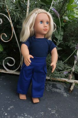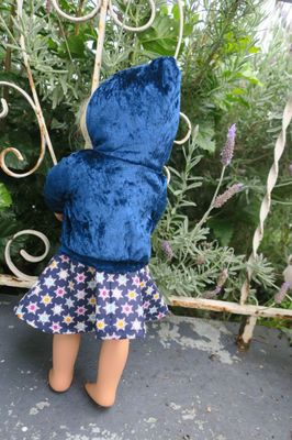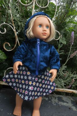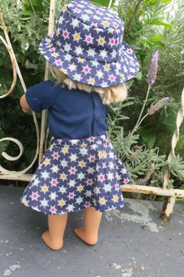 The cotton pants have cargo style pockets on the sides, with flap and a snap fastener on the back. The T-shirt is made from dark blue stretch cotton fabric and is fastened at the back with two blue snaps. The cotton skirt has a star print on a dark blue background, the sun hat is made from the same fabric and is lined with the same cotton fabric as the pants. The hoodie is made from stretch velvet fabric and has a sturdy front zip.